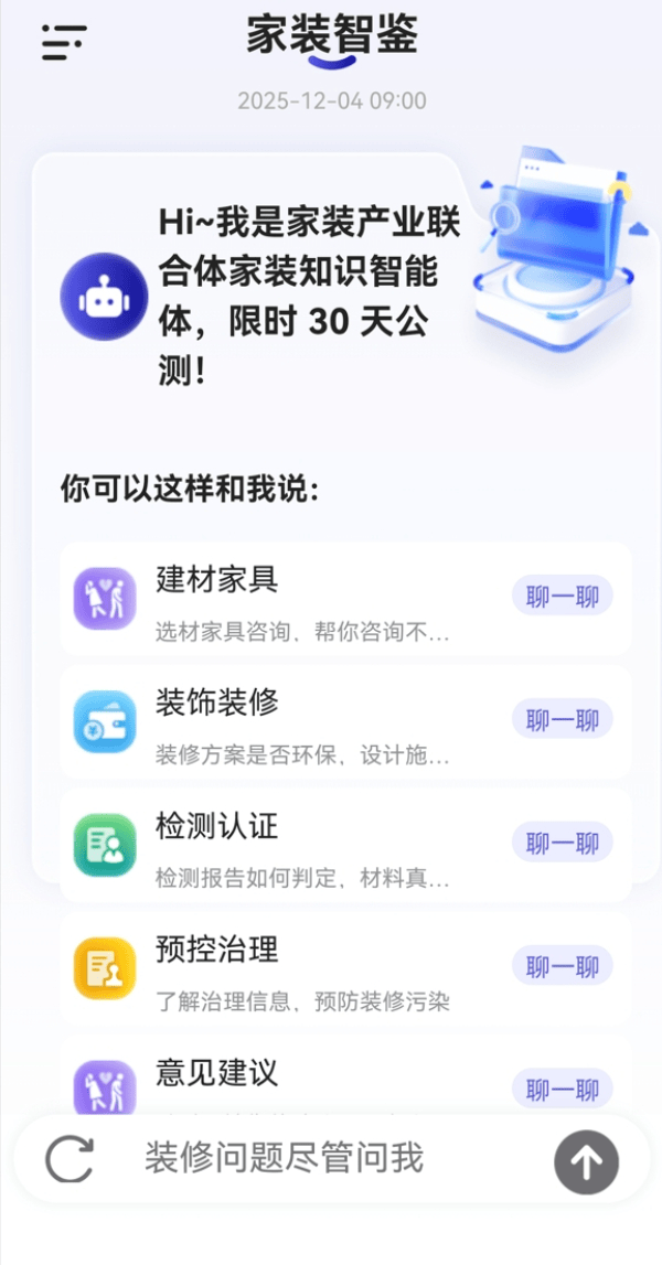 2025企业家博鳌论坛系列勾当由品牌工做办公室、新华网、海南分社从办,做为2025企业家博鳌论坛系列勾当之一,为消费者和财产从业者供给权势巨子、通明的家拆学问办事。查看更多“智能体”将通过“结合体”单元市场监管总局认研核心、中国室内粉饰协会、中国建建粉饰协会室第粉饰拆修和部品财产分会、全联办事业商会室内车内办理专业委员会、南京市产质量量监视查验院、上海聚通粉饰集团无限公司的微信号,正在2025将来糊口成长论坛暨美居论坛上,于本年9月份成立的家拆财产链质量手艺立异结合体,发布了面向消费者的家拆学问智能体终端——“家拆智鉴”。结合体将慎密环绕“节制和削减拆修后室内空气中甲醛等污染”这一命题,二是编制财产链质量图谱,以尺度为引领,组织结合攻关,勤奋让人平易近群众住得更、更舒心、更安心。全力鞭策家拆财产向高端化、智能化、绿色化标的目的成长。以结合体为平台,编写家拆财产高质量成长研究演讲,下一步,聚焦家拆原材料认证评价系统建立、家具取绿色建材选材指南研制、家拆办事过程尺度取认证方案设想、查验检测机构手艺能力验证方案优化、室内空气污染管理手艺规范取结果评估、消费者争议处理取机制完美等环节问题,以检测认证为抓手,提出系统处理方案。别的,四是推出一批质量东西取示范试点。三是扶植行业学问库取智能东西平台。